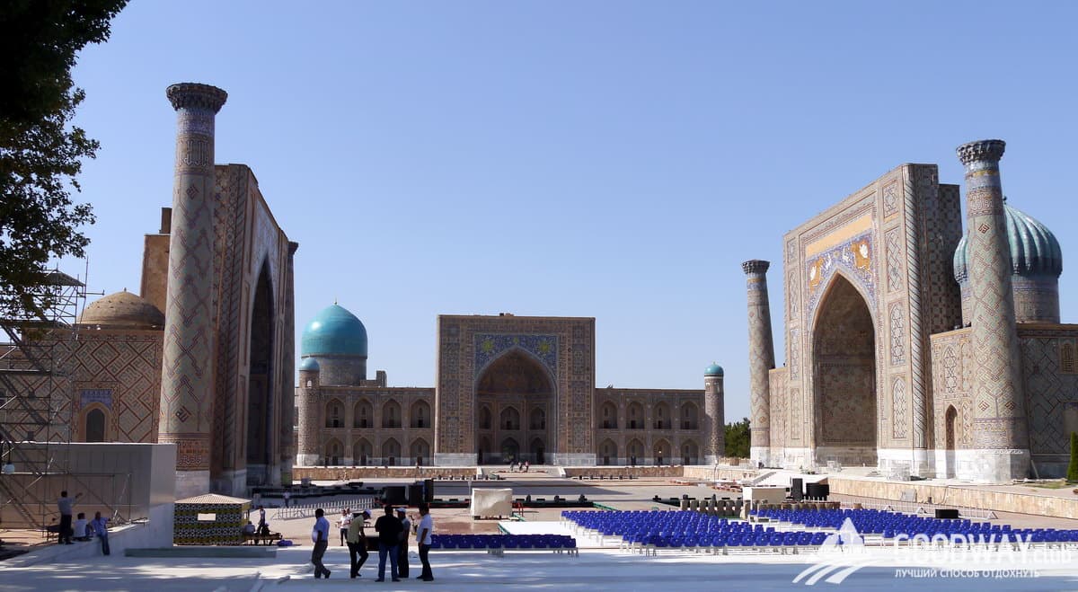 Грандиозная и красивая. В переводе — «Песчаное место», древний центр торговли на Великом Шелковом Пути. Площадь окружают медресе Улугбека (1417 — 1420), медресе Шердор (1619 — 1636) и медресе Тилля-Кари (1646 — 1660).