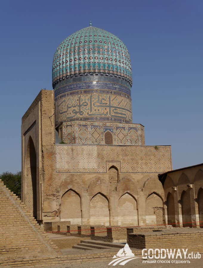Самая большая мечеть в Средней Азии, оставляет очень сильное впечатление. В переводе — «старшая принцесса», прежнее название — Масжиди джами. Построена Тамерланом в 1399 – 1404 гг. в качестве главной («пятничной») городской мечети. Каждую пятницу здесь молились 10 тысяч мужчин.
