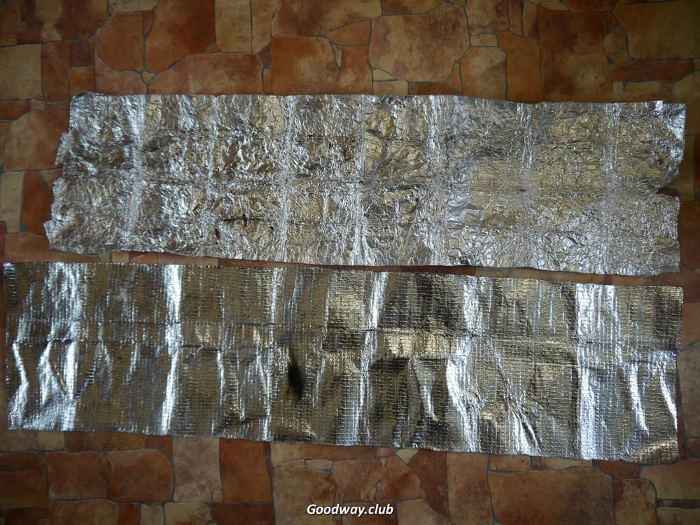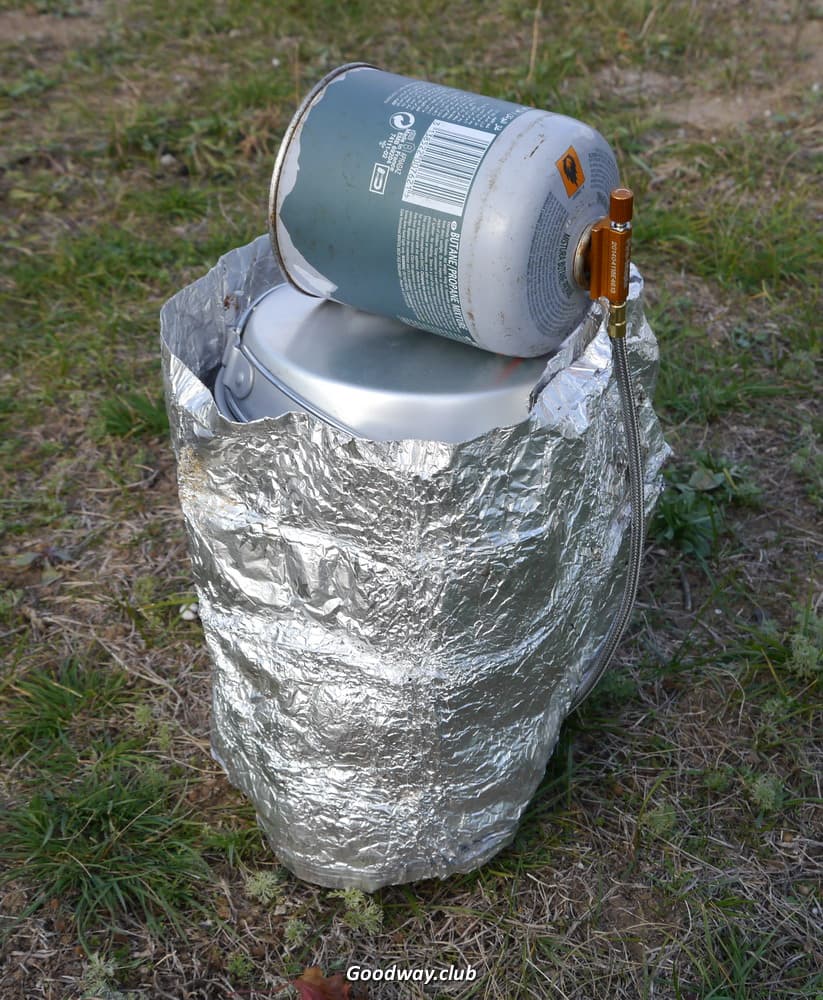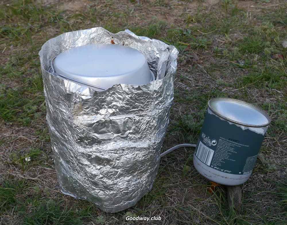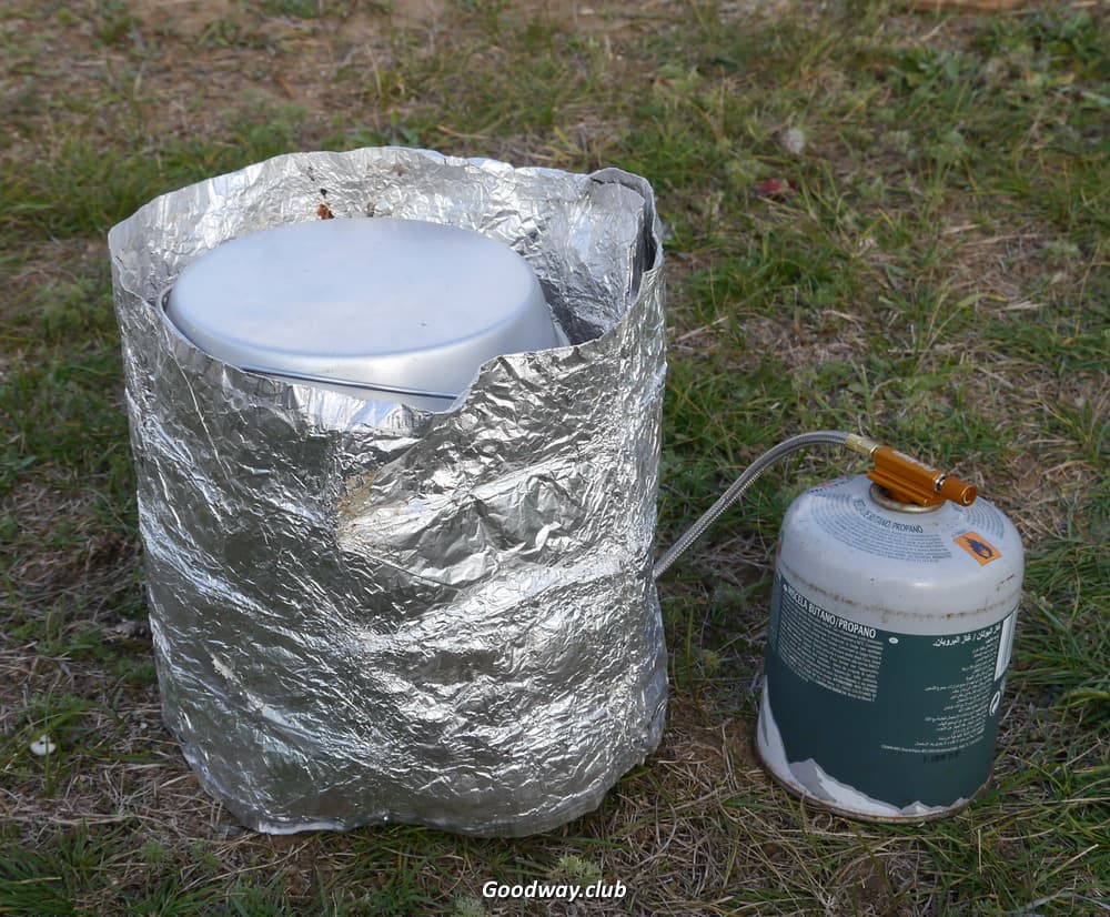 Ветрозащита, встроенная в некоторые горелки, не даёт пламени потухнуть. При сильном ветре у вас всё равно ничего не закипит, тепло будет сдувать. Поэтому встроенная в горелки ветрозащита – лишний вес и деньги. Ветрозащита нужна, но такая, которая закрывает кастрюлю до верха вместе с горелкой. Даже в отсутствие ветра она экономит до 25% газа. Продаются фирменные ветрозащиты из алюминиевой фольги или пластин, весят 100-250 гр. Смысла в них никакого. Как сделать ветрозащиту для горелки самостоятельно за 5 минут, гораздо более лёгкую и почти даром: Берёте кухонную алюминиевую пищевую фольгу, измеряете рулеткой длину окружности самой большой кастрюли (для 6л это 90см), прибавляете 7 см и складываете из фольги 5 таких полос одна на другую гармошкой, не разрывая. По всем краям загибаете по 1 см. Такая ветрозащита длиной 97 см и высотой 26 см весит 43грамма! Нужно обратить внимание на толщину фольги. Если ничего не написано, это 9 мкм (микрометров), или 0,009 мм. Такая не подходит, быстро прогорает. Бывают варианты 11 мкм, это уже годится, а бывают усиленные, 14 мкм, вот такая лучше всего. Именно такой была стандартная фольга времён СССР.