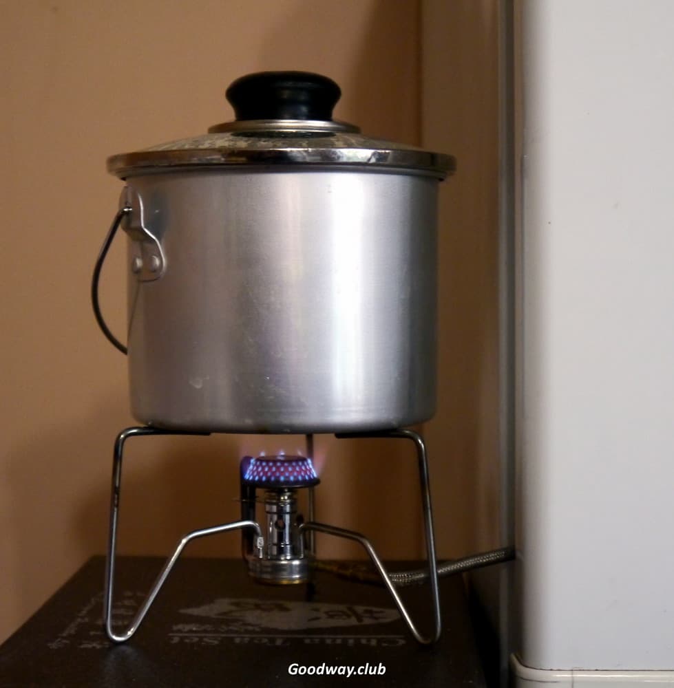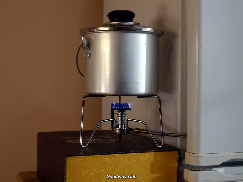3. Большая общая высота. Это заставляет использовать высокую ветрозащиту, которая должна закрыть не только огонь, но и всю кастрюлю. Обычно используют каремат (коврик), который усложняет доступ к кастрюле и запросто опрокидывается лёгким ветром вместе с кастрюлей. Также большая высота проблема, если готовить в тамбуре палатки. Особенно, если использовать более выгодные большие баллоны по 450гр.