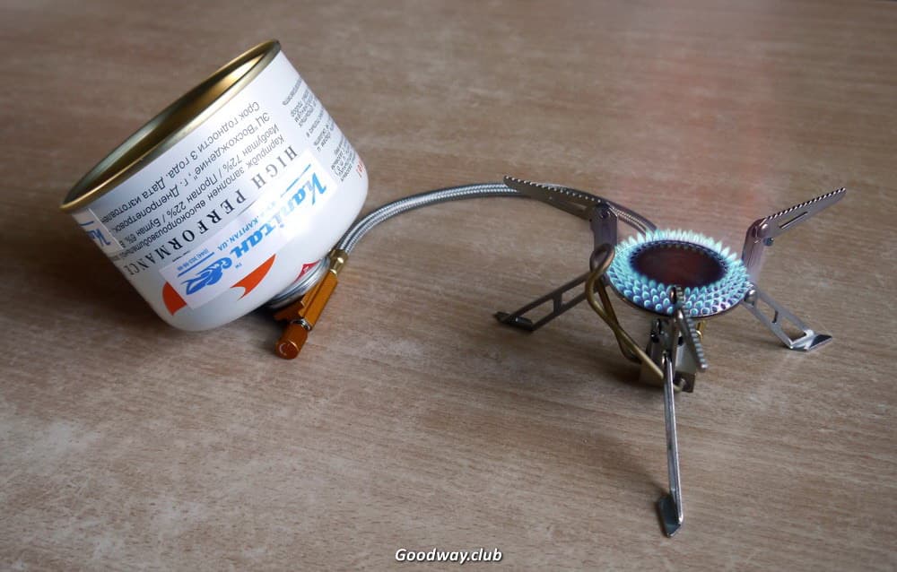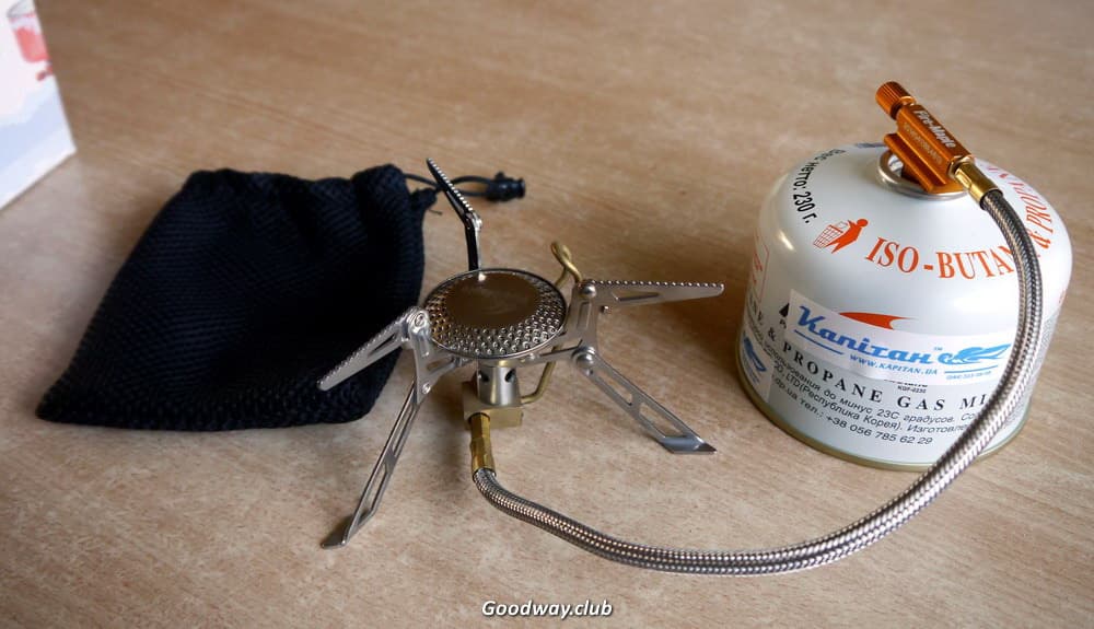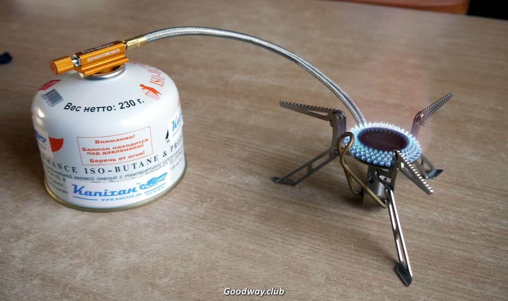 Конструкция: Шланговая, очень надёжная, компактная, лёгкая и простая горелка с нагревом газа. Длины шланга хватает, чтобы положить на кастрюлю баллон 450 гр. Складывается в тканевый мешочек, при этом сложенные ноги предохраняют шланг от перегиба и излома. Очень устойчивая конструкция, можно спокойно поставить на неё хоть ведро воды. Кружка 0,3л ставится в натяг, с заходом на подставки по 2мм. Поверхность под горелкой нагревается градусов до 60.