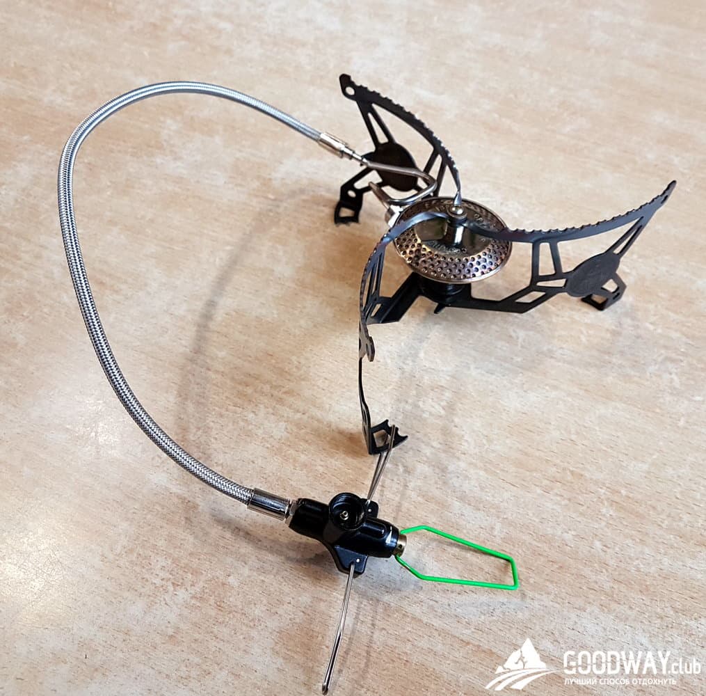 Конструкция: Мощная шланговая лёгкая горелка с нагревом газа. Самая лёгкая в обзоре. Конструкция ножек на первый взгляд кажется хрупковатой, но попытки как-то их согнуть выдерживают. Шланг достаточной длины. большой баллон 450 гр можно положить даже на 5-литровую кастрюлю. Больше всего не понравилось крепление шланга к горелке. При сложенных лапах согнутый в месте крепления шланг торчит в сторону, ничем не прикрытый. Небольшое давление может его сдавить и сломать. И сложенные лапы угловатые, могут помять/порвать то, что в рюкзаке к ним придавится. Так что полотняный мешочек, что идёт в комплекте, для транспортировки не годится. Горелку нужно прятать в кастрюлю или специальную твёрдую коробку.